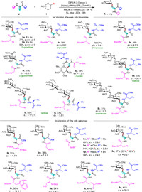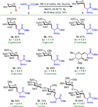 | Scheme 2. Scope of glycosyl bromides. Reaction conditions: A solution of 1 (0.2 mmol), 2 (0.24 mmol), PC 1 (2.0 mol%), HE (0.4 mmol) and Cs2CO3 (0.3 mmol) in MeCN (2 mL) was irradiated by 45 W blue LEDs for 18 h, isolated yields. The dr values were determined by 1H NMR analysis of crude reaction mixtures. | |