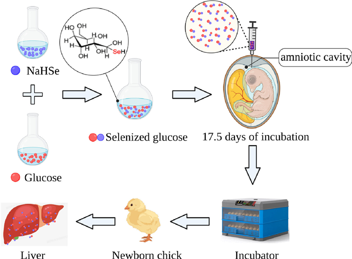 Selenium (Se) is a non-metal trace element that plays essential roles in maintaining the normal physiological functions of the liver [13]. Se typically occurs as the active center of selenoproteins [14]. Se can enhance the activity of selenoproteins such as glutathione peroxidase (GSH-Px) and thioredoxin reductase (TrxR) [15]. Se also plays physiological roles as a scavenger of free radicals, thereby preventing lipid peroxidation and promoting antioxidant activity [16]. In nature, Se generally exists in the form of either inorganic or organic Se compounds, among which, the former mainly include sodium selenite and sodium selenate selenium sulfide, which are characterized by high toxicity, poor absorption, and low bioavailability. Contrastingly, organic Se compounds, such as Se yeast (SY) and seleno-substituted amino acids, are demonstrated to have minimal toxicity, efficient absorption, and high bioavailability. However, the excessive costs limit the application of organic Se in livestock production [17]. Selenized glucose (SeGlu) is a newly invented organoselenium material [18] with high chemical stability and low toxicity [19]. It has already been widely applied in producing the Se-enriched agricultural products [20], which are popular nowadays because selenium is a key element for the health of human nervous, cardiovascular and hepatobiliary systems [21, 22]. Studies have shown that dietary supplementation with SeGlu can enhance the antioxidant activity of egg yolk and liver antioxidant capacity in laying hens [23, 24]. On the basis of these observations, we hypothesized that IOF of SeGlu would enhance Se reserves and antioxidant ability in newborn chicks. In this study, we thus sought to confirm this supposition by evaluating the influence of IOF of SeGlu on the antioxidant capacity of liver in neonatal broilers (Fig. 1).