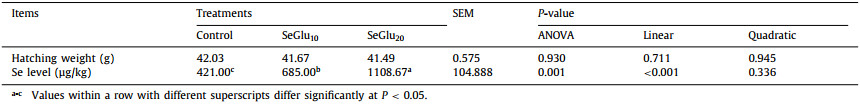 Table 1 Effects of in ovo feeding of selenized glucose (SeGlu) on hatching weight and selenium (Se) content on liver of chicks. |