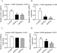 As shown in Table 2, compared with control group birds, broilers in the SeGlu20 group were characterized by significant increases in GSH-Px activity. Polynomial orthogonal contrast analysis revealed that the effects of SeGlu concentration on GSH-Px activity were both linear and quadratic, and that the latter model provided a better fit to the data. Compared with the control group, IOF of 10 µg Se was found to promote a significant reduction in liver glutathione (GSH) concentration, and we established that the response of GSH levels to an increase in SeGlu concentration was quadratic. Contrastingly, we detected no appreciable differences among treatment groups on glutathione reductase (GR) and TrxR activity.