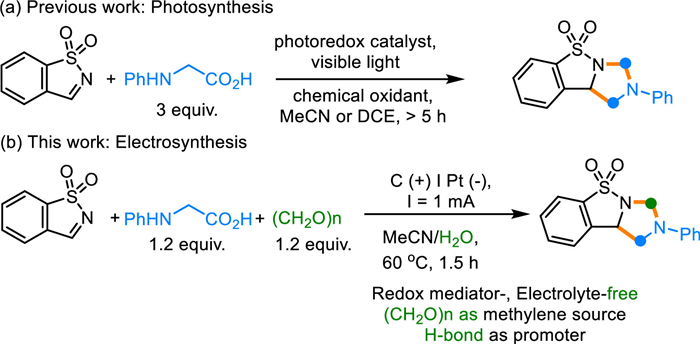 In summary, an H-bond promoted electrochemical [2 + 2 + 1] annulation of benzo[d]isothiazole 1,1-dioxides, N-arylglycines and (CH2O)n was successfully developed. This reaction allowed accessing various benzo[d]imidazo[1,5-b]isothiazole 5,5-dioxide derivatives in good to excellent yields. A paramount advantage of this method is that it does not require any catalyst, chemical oxidant, redox mediator and electrolyte. With (CH2O)n as the methylene source, this reaction offers a superior atom economy and practicability over the previous dual-component reactions. Mechanistic studies indicated that the hydrogen bond plays a vital role for generating the active PhNHCH2 radical at lower voltage. The present electrocatalytic reaction provides an economical and sustainable manner to make use of low-cost abundant paraformaldehyde, and would lead to tremendous applications in pharmaceutical chemistry and synthetic chemistry.