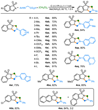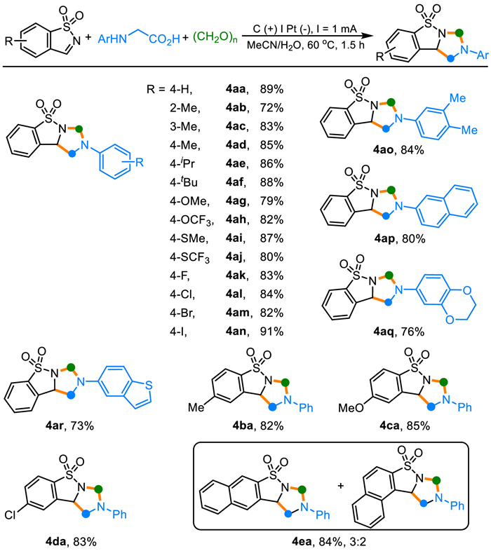 With the optimized reaction conditions in hand (Table 1, entry 1), the scope of the electrochemical [2 + 2 + 1] annulation was investigated. As shown in Scheme 2, the present electrochemical reaction was appropriate for a multitude of N-arylglycines. No matter whether the phenyl ring of N-phenylglycines was modified with either sterically hindered, electron-rich or electron-poor group, all of them gave the corresponding products (4aa-4an) in good to excellent yields. Many valuable functional-groups, such as alkyl (-Me, -iPr and -tBu), alkoxy (-OMe and -OCF3), methylthio (-SMe), trifluomethylthio (-SCF3) and halogen (F, Cl, Br and I) were introduced into the terminal products, proving the excellent functional group tolerance of this reaction. (3,4-Dimethylphenyl)glycine can also be used as the substrate, furnishing the annulation product 4ao in 84% yield. Importantly, N-functionalized glycine substrates with naphthalene (4ap) or heterocyclic ring (4aq and 4ar) were also compatible in the annulation system. No reaction occurred when pyridin-4-ylglycine or furan-3-ylglycine was used as the aminomethyl source. Electron-rich (4ba and 4ca) group-substituted as well as the electron-poor group-substituted benzo[d]isothiazole 1,1-dioxides (4da) delivered the annulation products in 82%−85% yields. Furthermore, when a regioisomeric mixture of 1e and 1e' was used, the corresponding products 4ea and 4ea' were formed as a mixture of regioisomeric with the same ratio.