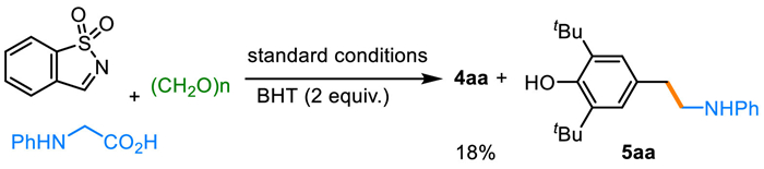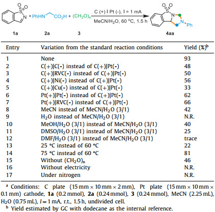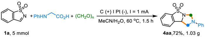 In the beginning, the reaction conditions for the electrochemical annulation of benzo[d]isothiazole 1,1-dioxide (1a), N-phenylglycine (2a) and (CH2O)n (3) were preferentially screened (Table 1). After a meticulous investigation of the reaction parameters, the optimized conditions were identified as graphite plate (C+) as anode and platinum plate (Pt-) as cathode in a solvent mixture of MeCN and H2O at a 3:1 vol ratio at 60 ℃, wherein the target product BIIO (4aa) was obtained in 93% GC yield after 1.5 h (entry 1). As shown in entries 2 to 7, unsatisfying experimental results were obtained when using other electrode pairs in the electrochemical transformation. With pure MeCN as the reaction medium, only 42% GC yield of 4aa was observed (entry 8). No reaction occurred when water was used as the solvent, perhaps due to the insolubility of the reagents (entry 9). Varying the aqueous solutions did not provide an improved yield of 4aa (entries 10–12). A strong temperature effect was noticed. Performing the annulation at 25 ℃ only gave 22% GC yield of 4aa (entry 13). Increasing the temperature from 60 ℃ to 75 ℃ led to an inferior result (entry 14). Product 4aa was generated in 46% GC yield in the absence of (CH2O)n (entry 15), indicating that (CH2O)n played an important role in this reaction. No product was observed in the absence of electricity (entry 16). Performing the reaction under nitrogen atmosphere failed to give the target product (entry 17).