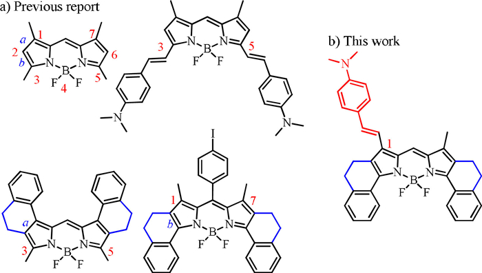 | Fig. 1. (a) BODIPY generated by Knoevenagel condensation and aromatic[b]-fused BODIPYs. (b) Structure of BODIPY with a (p-NMe2)styryl group at 1-site. | |