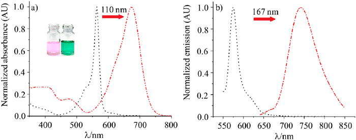 | Fig. 2. (a) Normalized absorption and (b) fluorescence spectra of BDP (black) and NBDP (red) in CH2Cl2 at 298 K. | |
