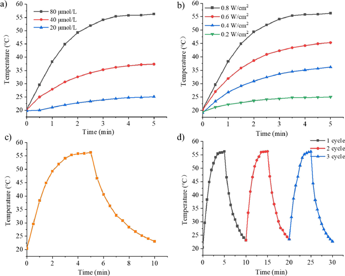 | Fig. 4. (a) Photothermal conversion of NBDP-NPs at varying concentrations (20–80 µmol/L) was investigated under 690 nm light irradiation (0.8 W/cm2). (b) Photothermal conversion of 80 µmol/L NBDP-NPs under 0.2–0.8 W/cm2 laser illumination. (c) Photothermal curve of 80 µmol/L NBDP-NPs in aqueous media under 0.8 W/cm2 light exposure and then naturally cooling to ambient temperature. (d) Evaluation of photothermal stability following three cycles of heating and cooling. | |