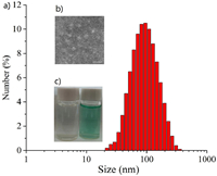 | Fig. 3. (a) The diameter of NBDP-NPs in aqueous solution detected by DLS. (b) Inset: TEM imaging. Scale bar: 300 nm. (c) Photo of pure water and NBDP-NPs in aqueous solution. | |