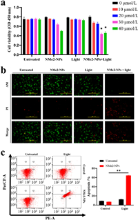| Fig. 5. (a) Cell viability to determine the concentration-dependent effect of NBDP-NPs (0–40 µmol/L). (b) Fluorescence images of co-stained AM and PI on after NBDP-NPs-treated with or without laser irradiation. Scale bar: 500 µmol/L. (c) Apoptosis analysis after treatment with NBDP-NPs alone, light alone, or their combination. Light irradiation (0.3 W/cm2, 20 min) and 30 µmol/L NBDP-NPs was applied. *P < 0.05, **P < 0.01 compared with control group. The error bars (n = 3) represent mean ± standard deviation (SD). For clarity, NBDP-NPs are abbreviated as NMe2-NPs in Fig. 5. | |