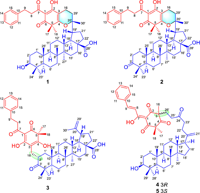 During the course of our continuing study on phloroglucinol derivatives from plants of family Myrtaceae, a number of novel PTAs with distinguished structural features and significant bioactivities were isolated, some of which had also been biomimetically synthesized [7-9, 12-15]. Recently, in order to discover natural products more efficiently, the building blocks-based molecular network (BBMN) strategy was presented by our group [16]. This strategy is based on the principle that natural products are comprised by specific precursors and display correspondent characteristic fragments in their tandem mass spectra. To further explore the unknown chemical space of PTAs, a BBMN-guided phytochemical investigation on two species of Myrtaceae plants, Leptospermum scoparium and Xanthostemon chrysanthus, was carried out. As a result, five unprecedented phloroglucinol-triterpenoid adducts, myrtphlotritins A–E (1–5), were identified (Fig. 1). To the best of our knowledge, these isolates represented the first examples of phloroglucinol-triterpenoid adducts in the PTAs kingdom. Specifically, compounds 1–3 from L. scoparium incorporated a phenylpropanoyl-triketone motif with a lupane-type pentacyclic triterpenoid unit via two different linkage patterns. Compounds 4 and 5 from X. chrysanthus constituted a pair of epimers, in which a phenylpropanoyl-triketone moiety and a dammarane-type tetracyclic nortriterpenoid unit were bridged through a carbon-carbon bond. Herein, we reported the discovery, structure elucidation, and hypothetical biogenetic pathways of these novel phloroglucinol-triterpenoid adducts. Additionally, the biomimetic synthesis of compound 1, as well as the antiviral and anti-inflammatory activities of 1–5 were discussed.