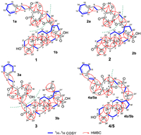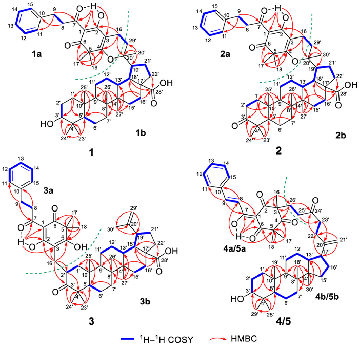 | Fig. 3. 1H−1H COSY and key HMBC correlations of 1–5. | |