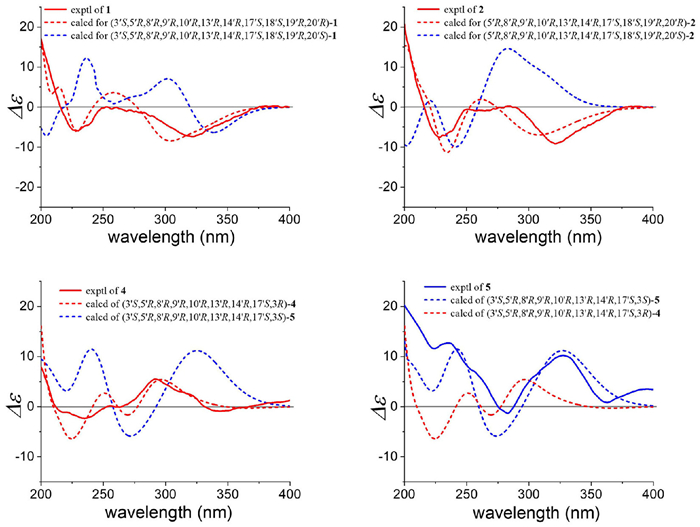 | Fig. 4. Experimental and calculated ECD spectra of 1, 2, 4, and 5. | |