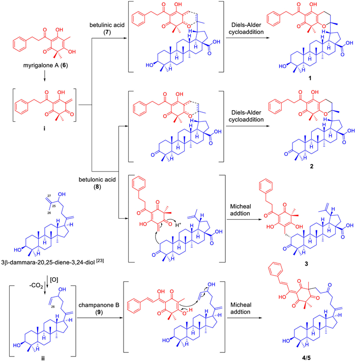 Compounds 1–5 represent the first examples of phloroglucinol-triterpenoid adducts with three types of new carbon skeletons. Based on the co-isolation of the precursors myrigalone A (6), betulinic acid (7), betulonic acid (8) and champanone B (9) from the title plants (see Supporting information), plausible biosynthetic pathways for 1–5 were proposed in Scheme 1. Briefly, oxidation of 6 could give the o-QM intermediate i, which could undergo hetero-Diels–Alder reactions with 7 and 8 to afford 1 and 2, respectively. Meanwhile, intermediate i could also couple with 8 to give 3 through a Michael addition reaction. In addition, the oxidation and decarboxylation of dammara-20,25-dien-3β,24-diol [23] could yield nortriterpenoid intermediate ii [25], which could couple with 9 to generate 4 and 5 through Michael addition reaction.