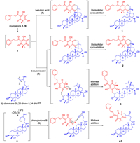 Phloroglucinol derivatives are typical secondary metabolites accumulated in the families Myrtaceae, Guttiferae, and Euphorbiaceae, which have shown broad bioactivities such as antimicrobial, anti-inflammatory, and antitumor effects [1-6]. Hitherto, over 2000 members of phloroglucinol derivatives have been reported [1-3]. Among them, the phloroglucinol–terpenoid adducts (PTAs) had drawn extensive considerations from both the chemical and biological communities, due to their diverse carbon skeletons and remarkable biological effects [4-7]. Biosynthetically, PTAs are commonly hypothesized to form by the coupling of the ortho-quinone methide (o-QM) and terpenoid intermediates [4-7]. For the latter, it is well known that monoterpenoid [8], sesquiterpenoid [9, 10], and diterpenoid moieties [11] can incorporate with o-QM to form the PTA architectures through different combinational patterns. However, as one of the largest and widely occurred motifs in plant secondary metabolites, the triterpenoid fragments have never been described in PTAs, leaving them as the missing pieces of the diversified PTAs family so far.