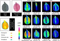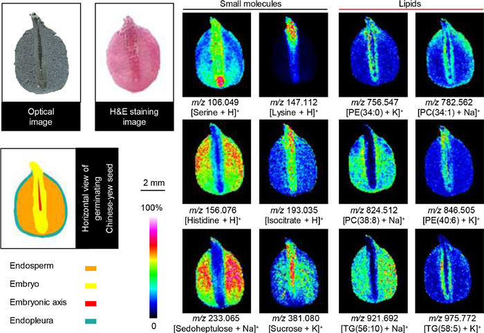 | Fig. 2. Representative ion images of small molecules and lipids in a germinating Chinese-yew seed section by MALDI-MSI with 4-NC as a matrix. The MS imaging was acquired at 100 µm spatial resolution. Ion images were generated with a bin width of ±0.2%. Scale bar: 2 mm. | |