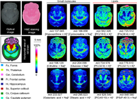 | Fig. 1. Representative ion images of small molecules and lipids in a rat brain tissue section by MALDI-MSI with 4-NC as a matrix. The MS imaging was acquired at a spatial resolution of 150 µm. Ion images were generated with a bin width of ±0.2%. Scale bar: 5 mm. | |