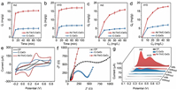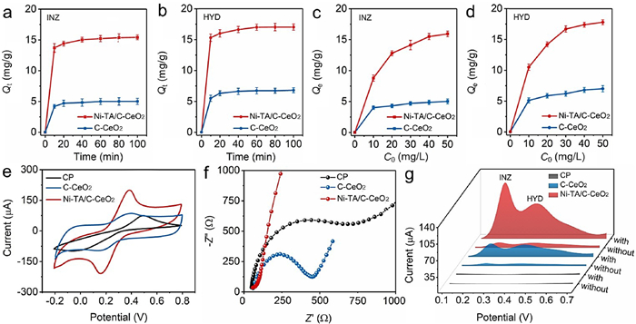 | Fig. 2. Adsorption property and electrochemical performance. Relationship between Qt and time: (a) INZ, (b) HYD. Relationship between Qe and C0: (c) INZ, (d) HYD. (e) CV curves, and (f) Nyquist plots of CP, C–CeO2 and Ni–TA/C–CeO2 in the potassium ferricyanide solution. (g) DPV curves of CP, C–CeO2 and Ni–TA/C–CeO2 in the 0.1 mol/L PBS solution (pH 7.0) containing 90 µmol/L INZ and 60 µmol/L HYD. | |