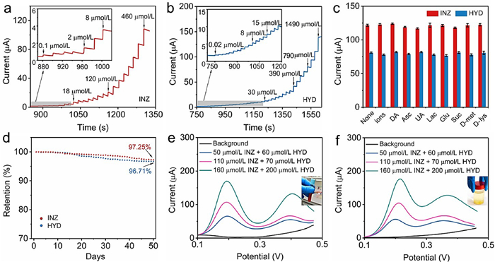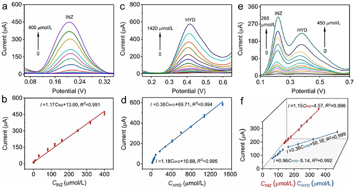 | Fig. 3. Detection performance of Ni–TA/C–CeO2. (a) DPV curves to different concentrations of INZ, and (b) corresponding calibration curve. (c) DPV curves to different concentrations of HYD, and (d) corresponding calibration curves. (e) Simultaneous detection of INZ and HYD, and (f) corresponding calibration curves. | |