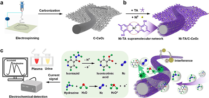 Electrochemical sensing with unique features in respect of low cost, fast response, easy operation, and feasible miniaturization, is an ideal platform for the detection of INZ and HYD [5,6]. However, it requires a functionalized electrode to capture the analytes, catalyze the redox reaction of analytes, and thus realize sensitive detection [7]. The main challenge in improving the detection sensitivity is to facilitate the mass transport on the surface of the electrode, as mass transport is usually the rate-controlling step of inhomogeneous reaction [8]. C–CeO2 nanofiber is a prominent electrocatalyst for its excellent adsorption properties and tunable physical/chemical properties of the surface [9,10]. The coexistence of CeⅢ and CeⅣ on its surface endows it with abundant active sites for the adsorbed species which would facilitate the mass transport on the surface of the electrode. In addition, according to the space charge theory, constructing a metal coordination interface could largely improve the mass transport of reactants [11]. Metal-phenolic networks (MPNs) is a versatile class of self-assembled supramolecular materials constructed from phenolic building blocks and metal ions through metal coordination [12,13]. Our group and others have recently been exploring these promising materials for energy and environmental applications [14,15]. Particularly, the native properties of polyphenols enable MPNs deposition onto various substrate materials, allowing for the rational design of functional films [16,17]. Additionally, the functionality of MPNs can be tuned through careful choice of the incorporated metal ions [18–20]. Caruso et al. demonstrated that MPNs constructed from NiⅡ are able to distribute in a way to specifically form strong interactions with the histidine and/or methionine residues of the Fc region of antibodies for enhanced targeting [21]. Therefore, we anticipate that constructing NiⅡ-incorporated MPN on C–CeO2 nanofiber could generate an ideal interface to interact with amino-abundant INZ and HYD molecules, thus enabling highly sensitive electrochemical detection of INZ and HYD.