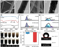 | Fig. 1. Physicochemical Characterization. (a) SEM, and (b) TEM images of C–CeO2. (c) SEM and (d) TEM images of Ni–TA/C–CeO2. (e) FTIR spectra of C–CeO2, Ni–TA/C–CeO2, and TA. XPS spectra in the (f) C 1s and (g) O 1s regions for C–CeO2 and Ni–TA/C–CeO2. (h) Images displaying the dispersion stability of C–CeO2 and Ni–TA/C–CeO2. (i) zeta potential of C–CeO2 and Ni–TA/C–CeO2. (j) Contact angles of water on the surfaces of C–CeO2 and Ni–TA/C–CeO2. | |