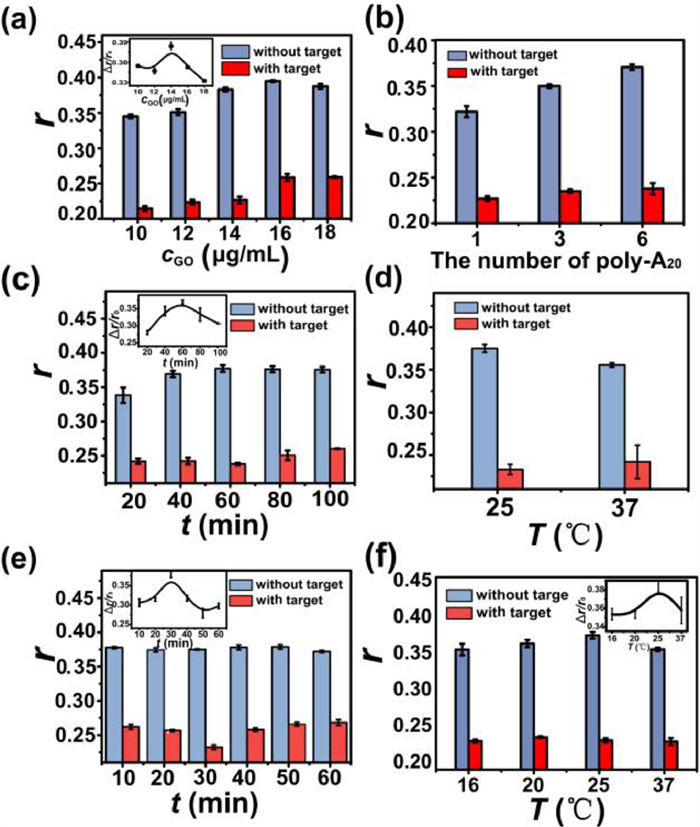 Furthermore, the influences of the temperature and reaction time of ODN and GO were investigated. With the extension of reaction time, Δr/r0 first increased and then reached its maximum value at 60min (Fig. 3c). When reaction time was too short, the "claws" of ODN did not have time to fix tightly on GO. Instead, when the reaction time became longer, GO would aggregate, resulting in small Δr because of the strong scattering effect. Fig. 3d showed that the optimal reaction temperature of ODN and GO was 25℃, rather than 37℃. Hence, lower temperature was more beneficial for GO to adsorb ssDNA.