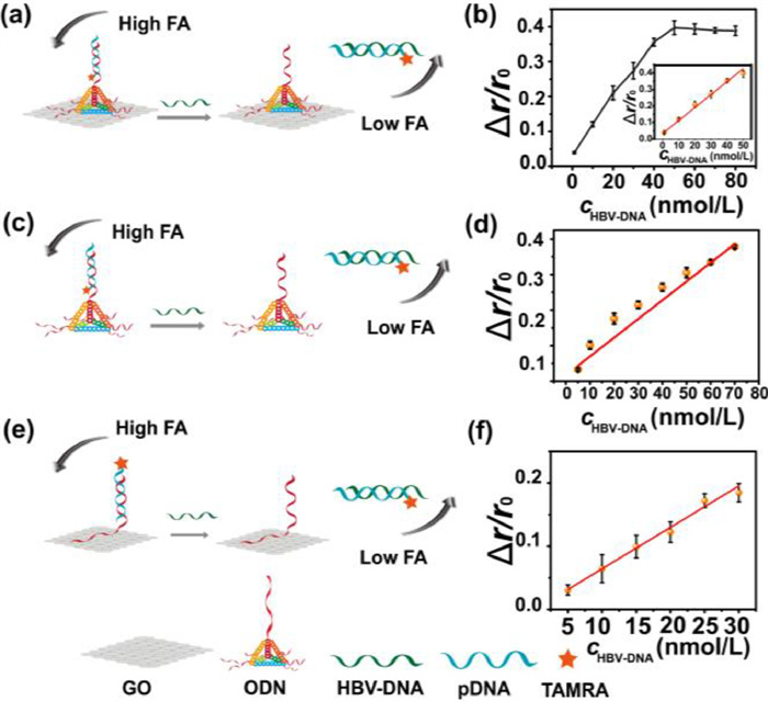 | Fig. 4. Comparation of the sensitivities of different FA amplification strategies. (a) Schematics for ODN and GO amplified FA strategy. (b) The linear relationship between Δr/r0 and HBV-DNA concentration with the double amplification effect of ODN and GO. (c) Schematics for ODN amplified FA strategy. (d) The linear relationship of between Δr/r0 and HBV-DNA concentration with the amplification effect of ODN. (e) Schematics for GO amplified FA strategy. (f) The linear relationship of between Δr/r0 and HBV-DNA concentration with the amplification effect of GO. Concentrations: ODN, 50nmol/L; pDNA, 50nmol/L; HBV-DNA, 40nmol/L; GO, 14.0µg/mL. | |