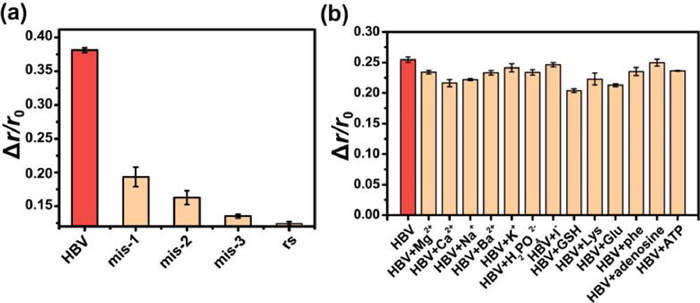 Besides, the reaction temperature and time after addition of HBV-DNA were also important factors. The experimental results (Fig. 3e) showed that when the reaction time of the HBV-DNA was 30min, Δr/r0 reached its maximum value. When reaction time was too short, HBV-DNA did not have time to fully compete with cDNA, and partial pDNA still bound with ODN-GO, inducing a high FA after the addition of the target. Similarly, if reaction time is too long, part of the HBV-DNA will be adsorbed on the surface of GO through π-π stacking, which means that the actual HBV-DNA to hybridize with pDNA is less than the amount of the added target, so the FA value will be reduced. As a consequence, there was not enough HBV-DNA to form a double-stranded structure with pDNA to produce a low fluorescence anisotropy value. At the same time, the optimum reaction temperature was 25℃ (Fig. 3f). When the temperature is lower than room temperature, the rate of DNA chain replacement reaction is low, so the r value is still large after adding the target, resulting in small Δr. On the contrary, when the reaction temperature is higher than room temperature, it is not conducive to the adsorption of ODN on GO, resulting in a decrease in Δr.