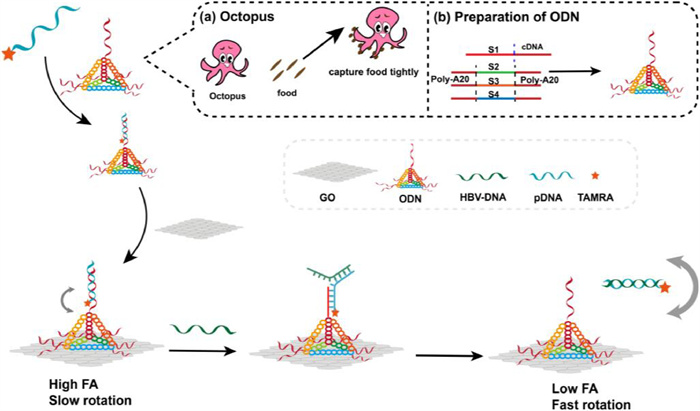In nature, octopus have eight sensitive arms and hundreds of suckers on each arm to catch food tightly [43,44]. Inspired by this natural phenomenon and in order to solve the problems existing in previous GO amplified FA method, we established a new strategy by using GO and octopus-like DNA nanostructure (ODN) to enhance FA together. Herein, DNA tetrahedron was designed to be the body of an octopus, and the six poly-A20 extending from the three vertices of the DNA tetrahedron are equivalent to the six claws of the octopus. The six claws were attached tightly to the GO through the π-π stacking [45,46]. At the same time, one of the remaining vertices of the DNA tetrahedron extended a strand of ssDNA, which was set up as the octopus's mouth and paired with a Carboxytetramethylrhodamine (TAMRA) modified probe. Thus, we not only took advantage of the rigid structure of ODN to avoid the fluorescence quenching effect of GO, but also limited the rotation of TAMRA with the large mass (or volume) of ODN and GO to achieve higher FA signal [47,48]. In this work, hepatitis B virus DNA (HBV-DNA) was chosen as a proof-of-concept target. As a common liver virus, HBV is an important cause of liver disease and a threat to human health and public health [49,50]. Therefore, we set up a simple and sensitive FA method to detect HBV-DNA by using the proposed double FA enhancement strategy.