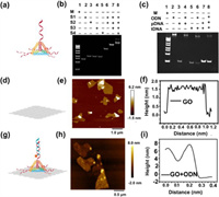 | Fig. 1. Characterization of (a-c) ODN, (d-f) GO and (g-i) ODN-GO. (b, c) Image of native PAGE (12%) analysis; M is marker. (e, h) AFM images. (f, i) the height profiles of AFM images. | |
