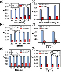 | Fig. 3. Optimization of the experimental conditions, including the concentrations of GO (a), the number of poly-A20 (b), the incubation times of ODN-GO complex (c), the incubation temperatures of OND-GO complex (d), the reaction times after addition of HBV-DNA (e) and the reaction temperatures after addition of HBV-DNA (f). Each measurement was triplicated (error bars indicate standard deviation). Concentrations: ODN, 50nmol/L; pDNA, 50nmol/L; HBV-DNA, 40nmol/L; GO, 14.0µg/mL. | |