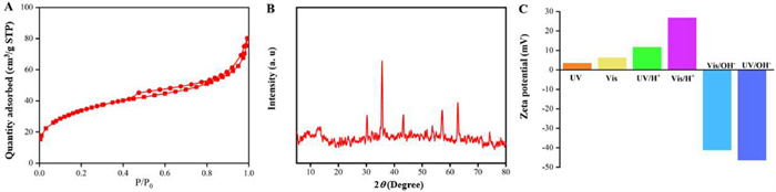 | Fig. 2. (A) N2 adsorption-desorption curve, (B) XRD pattern, and (C) zeta potential values of Fe3O4@ZW-MOF. | |