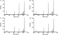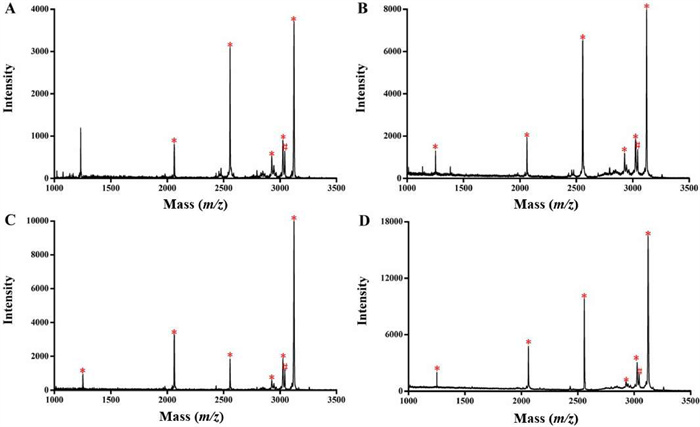 | Fig. 3. MALDI-TOF mass spectra of phosphorylated peptides enriched by Fe3O4@ZW-MOF under different conditions: (A) UV + 70% ACN; (B) Vis + 70% ACN; (C) UV + 70% ACN/0.1% FA; (D) Vis + 70% ACN/0.1% FA. "*" represents phosphorylated peptide peak, "|" represents dephosphorylated peptide peak, and non-labeled represents non-phosphorylated peptide peak. | |