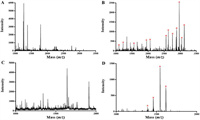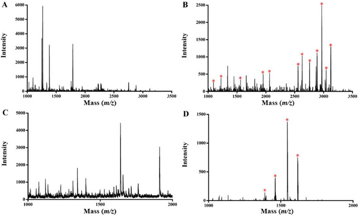 | Fig. 4. MALDI-TOF mass spectra of (A, B) tryptic digests of non-fat milk and (C, D) human serum: (A, C) direct detection; (B, D) after Fe3O4@ZW-MOF enrichment. "*" represents phosphorylated peptide peak. | |