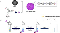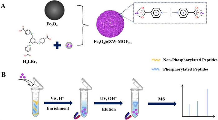 | Scheme 1. (A) Synthesis process of Fe3O4@ZW-MOF and (B) enrichment process of phosphorylated peptides by Fe3O4@ZW-MOF. | |