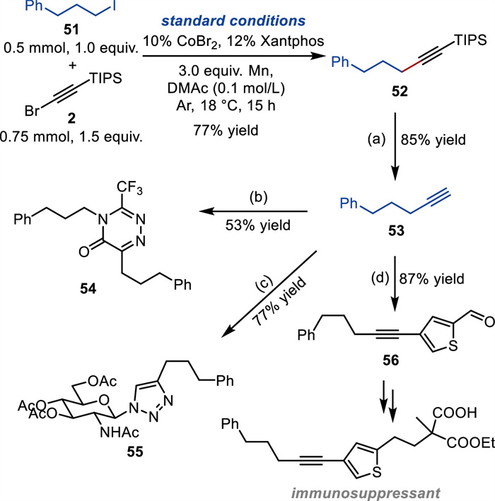 We further demonstrated the utility of this reaction by employing it as a tool for synthesizing functional molecules (Fig. 2). Standard conditions were performed on the conversion of substrate 51, generating the desired product 52 in a 77% isolated yield. Triisopropylsilyl protecting group could be easily removed under stirring in a TBAF solution, and terminal alkyne 53 was attained. The carbon-carbon triple bond could be transformed into various functional groups. For example, 3-trifluoromethyl-substituted 1, 2, 4-triazinone (54) could be synthesized by the trifluoroacetic anhydride promoted copper-catalyzed interrupted Click reaction [71]. In another example, peracetylated d-glucosamine triazole derivative (55) could be prepared through copper-catalyzed azide/alkyne cycloaddition, which might have applications as a low molecular weight gelator in the field of advanced soft materials [72]. Finally, an immunosuppressant intermediate 56 could be obtained via canonical Sonogashira reaction.