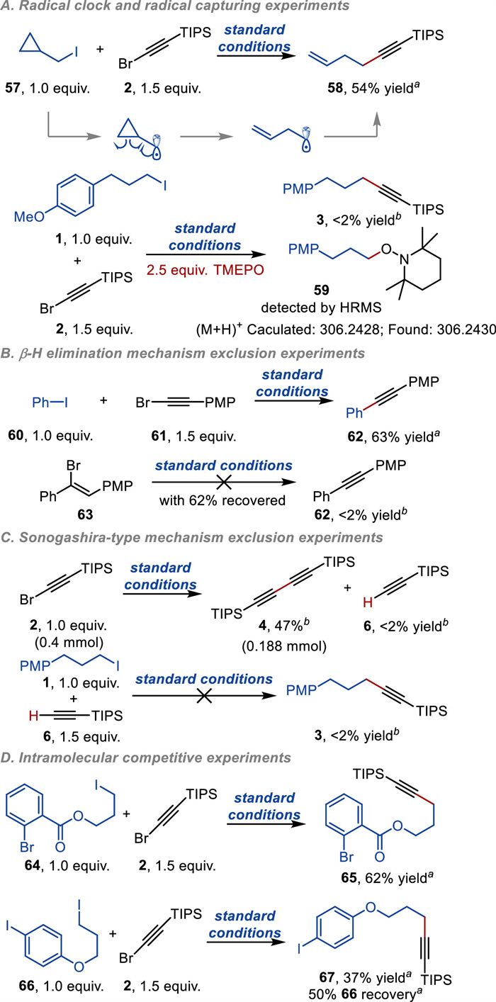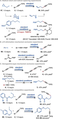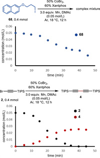 We conducted mechanistic studies to gain insights into this reductive cross-coupling reaction (Fig. 3). As shown in Fig. 3A, ring-opened product 58 was isolated in the reaction of (iodomethyl)cyclopropane (57). The model reaction would be inhibited after adding a radical inhibitor (TEMPO). In addition, HRMS confirmed the formation of radical trapping product 59. Therefore, alkyl radicals might be the reaction intermediates during the transformation. Iodobenzene (60) reacted with 1-(bromoethynyl)-4-methoxybenzene (61) smoothly to deliver the product 62 under standard conditions. In comparison, alkenyl bromide 63 could not be converted to the anticipated product 62, excluding the possibility of a radical addition and subsequent β-H elimination mechanism (Fig. 3B). In the absence of alkyl iodides, homo-coupling of alkynyl bromide dominated, with only a trace amount of alkynyl bromide hydrodehalogenation byproduct 6 observed. In addition, we performed the standard conditions to terminal alkyne 6 and alkyl iodide 1; however, we could not detect the production of compound 3. The above results negated the possibility of an in-situ Sonogashira-type reaction (Fig. 3C). In the intramolecular competitive experiments (Fig. 3D), we performed the standard conditions to substrate 64 containing both aryl bromide and alkyl iodide, delivering the C(sp)-C(sp3) coupling product 65 in a 62% isolated yield. Moreover, in the case of a substrate (66) containing both aryl and alkyl iodides, the reductive alkynylation occurred at the alkyl iodide site (67). The moderate yield was attributed to a low conversion ratio. The above results indicated that alkyl iodide has higher priority reactivity than aryl electrophiles. Finally, conversion rates comparison experiments in Fig. 4 also demonstrated that alkynyl bromide was hyperactive and might have priority in the oxidative addition step.