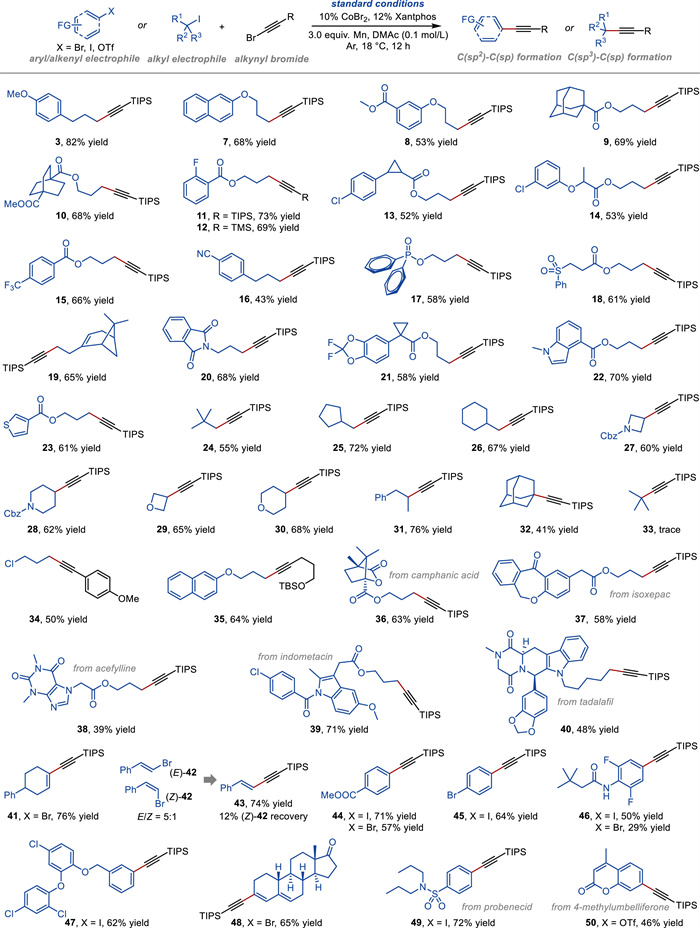 | Scheme 1. Substrate scope. Standard conditions: aryl/alkenyl/alkyl electrophile (0.2 mmol, 1.0 equiv.), alkynyl bromide (0.3 mmol, 1.5 equiv.), CoBr2 (0.02 mmol, 10 mol%), Xantphos (0.024 mmol, 12 mol%), Mn (0.6 mmol, 3.0 equiv.), DMAc (2.0 mL, 0.1 mol/L), 18 ℃, 12 h. Isolated yields. Cbz, carbobenzoxy; TBS, tert-butyldimethylsilyl. | |