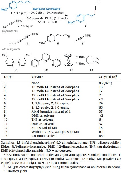 As shown in Table 1, we began our study by screening the optimal reaction conditions using 1-(3-iodopropyl)-4-methoxybenzene (1) and (bromoethynyl)triisopropylsilane (2) as model substrates. We determined that the reductive alkynylation reaction underwent smoothly using a combination of 10 mol% CoBr2 and 12 mol% Xantphos as the catalyst, 3.0 equiv. Mn powder as the reductant in DMAc, delivering the cross-coupling product 3 in 86% GC yield and 82% isolated yield (entry 1). The selection of bisphosphine ligand Xantphos was crucial for the success: bipyridine (L1), terpyridine (L2), and other bidentate bisphosphine ligands (L3 and L4) gave out significantly decreased yields (entries 2-5). Careful analysis of the reaction mixture showed that the main byproducts were alkynyl bromide homo-coupling byproduct 4 and alkyl halide hydrodehalogenation byproduct 5. Only trace amount of alkynyl bromide hydrodehalogenation byproduct 6 was observed. Changing the ratio of alkyl halide versus alkynyl bromide from 1:1.5 to 1:1 or 1.5:1 would decrease the coupling yields, which might be caused by the higher reactivity of alkynyl bromide substrates (entries 6 and 7). Alkyl bromide has a lower reactivity than the corresponding alkyl iodide (entry 8). Compared with the optimized solvent DMAc, the reaction shut down in low polarity solvents (entries 9 and 10) and delivered a much reduced yield in DMF (entry 11). We also evaluated the performance of Zn powder as the reductant; however, far inferior compared to Mn (entry 12). Control experiments proved that cobalt-catalyst, ligand, and Mn reductant were indispensable (entry 13). Finally, we conducted a larger scale reaction (2.0 mmol scales) under standard conditions (entry 14). The desired product 3 was obtained in a 66% isolated yield (435 mg product).