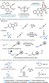 Cobalt catalysis showed high efficiency for carbon–carbon bond formation [61–63], reflecting the solid ability to activate alkyl and aryl (pseudo)halides effectively. In continuous of our research interests on cobalt-catalyzed cross-coupling reactions with aliphatic electrophiles [64–67], we report a general method, cobalt-catalyzed reductive alkynylation, to construct C(sp)-C(sp3) and C(sp)-C(sp2) bonds (Fig. 1D). This presented reaction has a broad substrate scope and excellent functional group compatibility, enabling the efficient cross-electrophile coupling between alkynyl bromides with alkyl halides and aryl or alkenyl (pseudo)halides. This reaction provides a powerful tool for the late-stage modification of complex biologically active molecules.