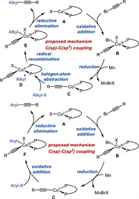 Based on relevant literature and our experimental results [14,73–78], we proposed the mechanism in Fig. 5. The initial CoⅠX (A) catalyst could be generated by reducing pre-catalyst CoBr2 by Mn. Alkynylcobalt species (B) was formed through the oxidative addition of alkynyl bromide to CoⅠX (A). Then, alkynylcobalt species B underwent a reduction process to access another lower valent alkynylcobalt species C. The subsequent halogen-atom abstraction and radical recombination (for alkyl electrophiles) or oxidative addition (for aryl or alkenyl electrophiles) provided CoⅢ species (E or F). Finally, the reductive elimination on CoⅢ species (E or F) produced the target product and regenerated the initial catalyst A. However, other catalytic cycles involving different valence variations and transport processes could not be ruled out.