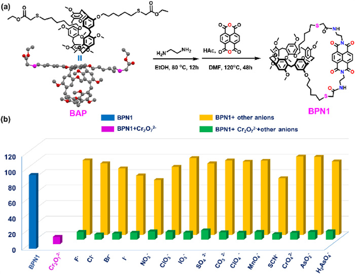 | Fig. 1. (a) The single-crystal structure of BAP and synthesis of the fused bi-macrocyclic BPN1. (b) Fluorescence intensity (λ ex = 360 nm, λ em = 425 nm) of BPN1 (1 × 10−4 mol/L) in the presence of various anions (50 equiv.) in DMSO/H2O (9: 1, v/v). | |