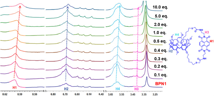 In the 1H NMR titration experiments (Fig. 2), after the gradual addition of 10 equiv. of Cr2O72− into the BPN1 solution, the proton signal of H1 on the outer ring showed upfield shift, which is due to the anion-π interaction between the NDI group and Cr2O72−. In addition, the proton H1 signal on the outer ring is also shifted upfield, indicating that there may be hydrogen bonds between the alkyl chain on the outer ring and Cr2O72−. Both H2 and H4 on the pillar[5]arene cavity are shifted to high fields, indicating that there may also be hydrogen bonds and anion-π interactions between the pillar[5]arene cavity and Cr2O72−. Moreover, in the corresponding FT-IR spectra, upon the addition of Cr2O72− into the BPN1, the -NH signal shifted from 3398 cm−1 to 3427 cm−1, while the C=O signal shifted from 1705 cm−1 to 1690 cm−1. These shifts could be attributed to Cr2O72- binding with -NH to form -N-H Cr2O72− hydrogen bonds (Fig. S23 in Supporting information).
