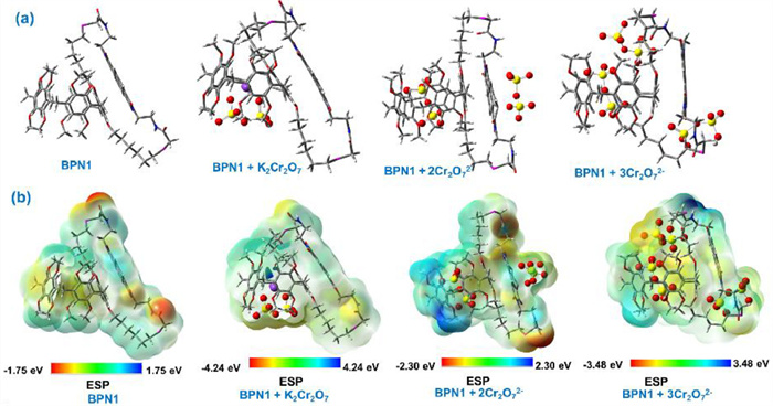 | Fig. 3. (a) Side view the structure optimization. (b) The ESP (the electrostatic potential maps) of free BPN1, [BPN1+ K2Cr2O7], [BPN1+ 2Cr2O72−], [BPN1+ 3Cr2O72−] at the ωB97XD/6–311+G(d, p) level. | |