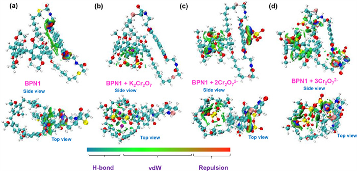| Fig. 4. IGMH analysis of (a) free BPN1, (b) [BPN1+ K2Cr2O7], (c) [BPN1+2Cr2O72−], (d) [BPN1+3Cr2O72−] at the ωB97XD/6–311+G(d, p) level. | |