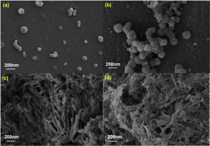 | Fig. 5. SEM images showing the morphology of (a) BPN1; (b) BPN1+ Cr2O72−; (c) BPN1+ 2Cr2O72−; (d) BPN1+ 3Cr2O72−. | |
