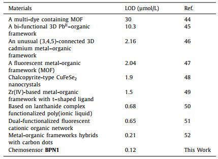 In order to test the enrichment effect of the BPN1, host-guest interactions were investigated by adding 50 equiv. of various anions (F−, Cl−, Br−, I−, NO3−, ClO3−, IO3−, SO42−, CO32−, ClO4−, MnO42−, SCN−, CrO42−, Cr2O72−, AsO2−, H2AsO4−, 0.1 mol/L, water solution) into the solution (DMSO/H2O, 9:1, v/v) of BPN1 (1 × 10−4 mol/L), respectively. As shown in Fig. 1b and Fig. S15 (Supporting information), only Cr2O72− could induce the fluorescence decrease of the BPN1 solution, while other anions could not induce a similar response. These results indicated that BPN1 possesses selective recognition properties for Cr2O72−. In addition, in the presence of other anions (F−, Cl−, Br−, I−, NO3−, ClO3−, IO3−, SO42−, CO32−, ClO4−, MnO4−, SCN−, AsO2−, and H2AsO4− (50 equiv.)), Cr2O72− (50 equiv.) was added to BPN1 (1 × 10−4 mol/L) and fluorescence experiments were carried out (Fig. S16 in Supporting information) [42]. The results show that the existence of the other anions does not interfere with BPN1 recognition of Cr2O72−. According to competing experiments (Fig. 1b) and coexisting anions experiments, coexisting anions could not influence the Cr2O72− recognizing process, which demonstrated the good anti-interference ability of BPN1 on selective sensing Cr2O72−. Furthermore, according to the fluorescent titration experiments (Fig. S17 in Supporting information), with the gradual fluorescence intensity of the BPN1 solution at 425 nm decreased by degrees. In addition, based on the fluorescence titration spectra and calculation via the 3σ/m method (Figs. S18-S20 in Supporting information) [43], the lowest limit of detection (LOD) of the BPN1 to Cr2O72− is 1.27 × 10−7 mol/L, which indicated that the BPN1 has a high sensitivity for detection of Cr2O72−. Meanwhile, as shown in Table 1 [44–52], compared with reported Cr2O72− sensing materials, the BPN1 possesses considerably higher sensitivity.