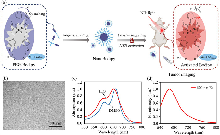 | Fig. 1. (a) Schematic response mechanism of tumor-targeted NIR fluorescence imaging achieved by self-assembled NTR-activated nanoprobe NanoBodipy. (b–d) Characterization of NanoBodipy. (b) TEM image of NanoBodipy. Scale bar: 500 nm. (c) UV-visible-NIR absorbance spectrum of NanoBodipy in deionized water and dimethyl sulfoxide (DMSO). (d) Fluorescence spectrum of activated NanoBodipy in Tris buffer containing 3% DMSO. | |