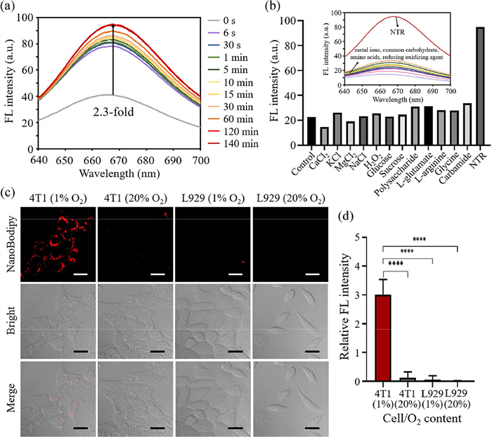 | Fig. 2. Sensitivity and selectivity of NanoBodipy for NTR activation in the solution and in the cells. (a) Fluorescence emission spectrum of NanoBodipy reacted with NTR. (b) Fluorescence responses of NanoBodipy (0.5 µmol/L) reacted with various species: control (NanoBodipy + 500 µmol/L NADH) and with CaCl2 (50 mmol/L), KCl (50 mmol/L), MgCl2 (50 mmol/L), NaCl (50 mmol/L), H2O2 (1 mmol/L), glucose (10 mmol/L), sucrose (10 mmol/L), polysaccharide (10 mmol/L), l-glutamate (1 mmol/L), l-arginine (1 mmol/L), glycine (1 mmol/L), carbamide (10 mmol/L), and NTR (10 µg/mL). (c) Fluorescence images of 4T1 and L929 cells incubated with NanoBodipy for 24 h. Scale bar: 25 µm. (d) Relative fluorescence intensities of 4T1 and L929 cells incubated with NanoBodipy for 24 h. Each point with an error bar represents the mean ± standard deviation (SD) (n = 4). ****P < 0.0001 (t-test). | |