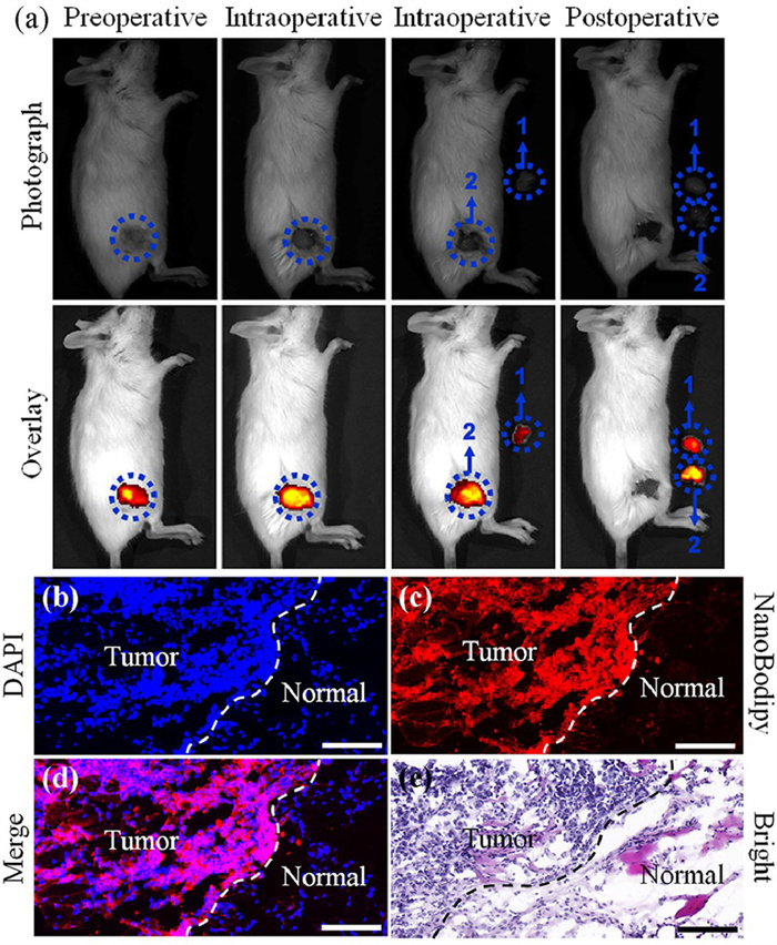 | Fig. 4. Intraoperative guidance of NanoBodipy for complete tumor resection by fluorescence imaging. (a) Fluorescence-guided surgery of 4T1 tumor resection. Animal had undergone the surgery at 24 h after injection of NanoBodipy. 1: first resection; 2: second resection. (b–d) Ex vivo fluorescence images of 4T1 tumor resected at 24 h post intravenous injection of NanoBodipy. (e) Histology examination of 4T1 tumor resected at 24 h post intravenous injection of NanoBodipy. Scale bar: 100 µm. DAPI: 4′,6-diamidino-2-phenylindole. | |