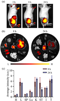 | Fig. 3. In vivo and ex vivo fluorescence images of NanoBodipy at different time points. (a) In vivo fluorescence images of 4T1 tumor-bearing mice injected with NanoBodipy at 2, 8 and 24 h. (b) Ex vivo fluorescence images of main organs and tumor obtained at 8 and 24 h post-injection. (c) Quantified fluorescence biodistribution of NanoBodipy (H: heart; L: liver; SP: spleen; Lu: lung; K: kidney; ST: stomach; I: intestine; T: tumor). Each point with an error bar represents the mean ± SD (n = 3). | |