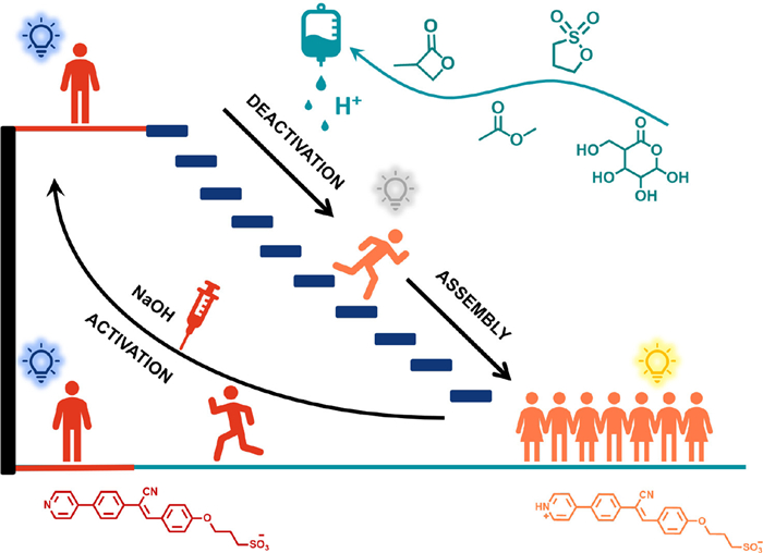 | Fig. 1. Molecular structures and schematic representation of temporal-controlled assembly system with time-dependent multicolor fluorescence. | |